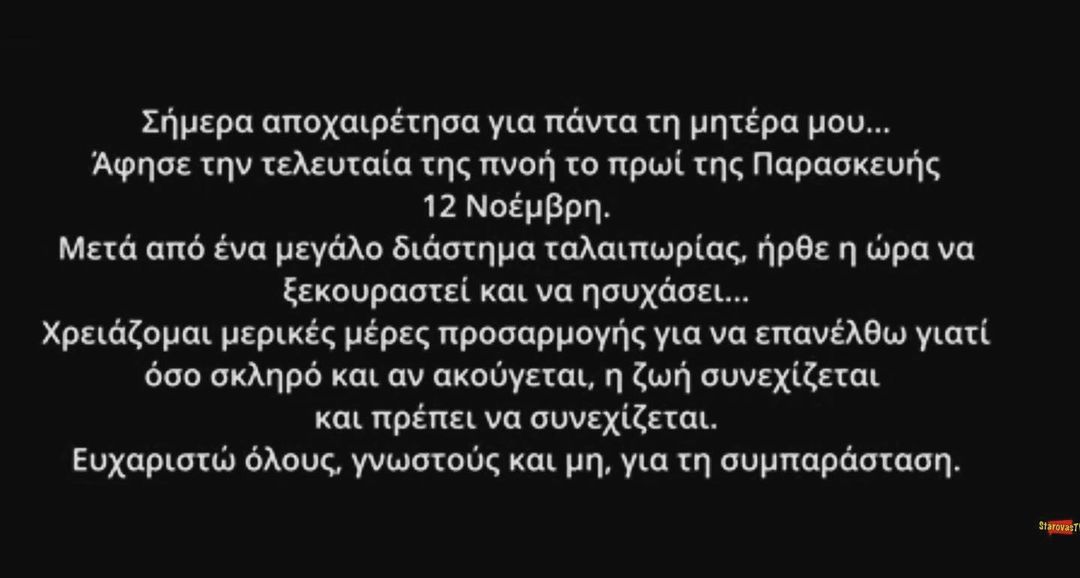 Ειδικότερα ο Σταρόβας, σήμερα το απόγευμα προχώρησε σε μια σπαρακτική ανάρτηση για τον χαμό της μητέρας του, ευχαριστώντας για όλα τα μηνύματα στήριξης που δέχτηκε.