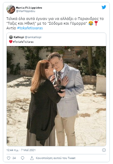 Τελικά αυτό που έμεινε είναι πως η αγάπη πάντα νικάει… Οι δυο τους θυσίασαν τον έρωτά τους που έμεινε αλώβητος στα χρόνια, για χάρη των παιδιών τους που παντρεύτηκαν. Η Χαρά όμως κρατούσε το καλύτερο για το φινάλε. Ανακοίνωσε στον Περίανδρο ότι είναι έγκυος και το παιδί τους θα είναι έξι μήνες μικρότερο από το εγγόνι τους! Το twitter όπως ήταν αναμενόμενο απόλαυσε το τελευταίο επεισόδιο και το αποχαιρέτησε με συγκίνηση και αγάπη!
