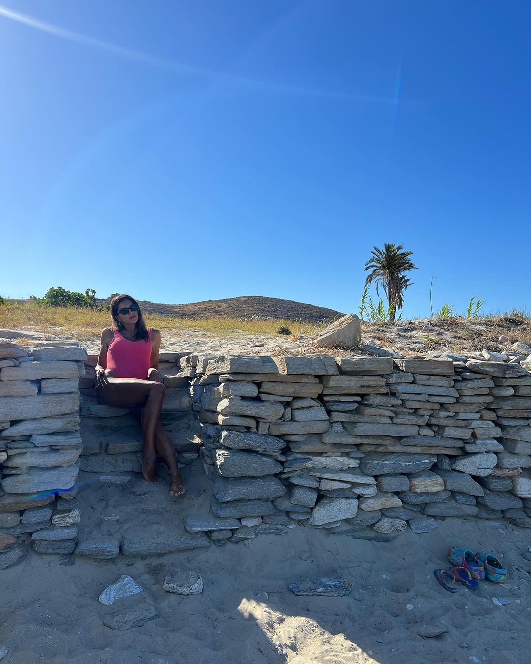 Η παρουσιάστρια, φορώντας ένα πανέμορφο φούξια ολόσωμο μαγιό και μεγάλα γυαλιά ηλίου, ποζάρει χαλαρή και ξέγνοιαστη σε μία ήρεμη παραλία της Πάρου θυμίζοντας μελαχρινή Barbie.