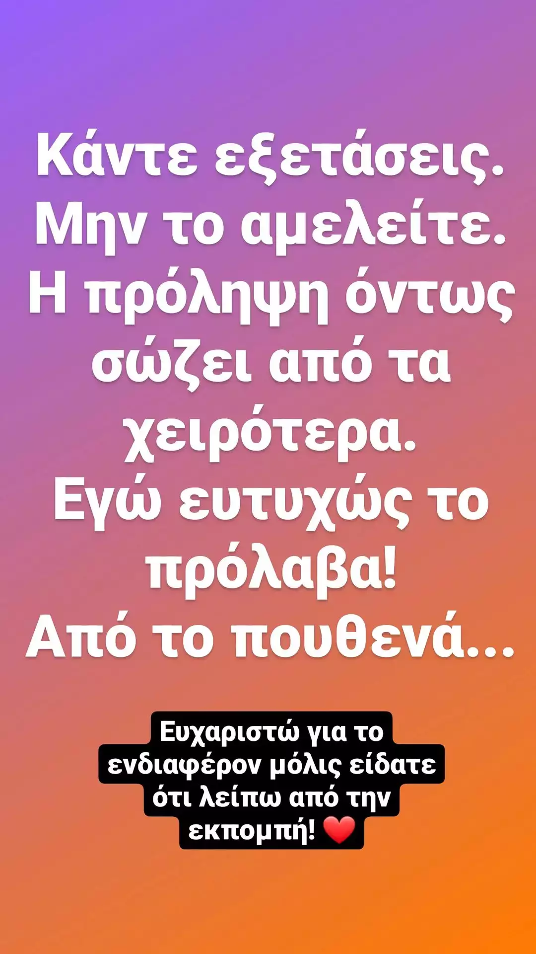 Ο Κώστας Τσουρός έγραψε χαρακτηριστικά: «Κάντε εξετάσεις, μην το αμελείτε, η πρόληψη όντως σώζει από τα χειρότερα. Εγώ ευτυχώς το πρόλαβα, από το πουθενά. Ευχαριστώ για το ενδιαφέρον μόλις είδατε ότι λείπω από την εκπομπή».