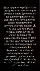«Είναι κρίμα να περνάμε τέτοια μηνύματα στον κόσμο για μια γυναίκα, η οποία βρίσκεται σε μια ευαίσθητη περίοδο της ζωής της, που κάνει μία τόσο μεγάλη προσπάθεια να γεννήσει ένα γερό παιδάκι. Την ίδια ώρα που άλλες γυναίκες παλεύουν για να ζήσουν το θαύμα της μητρότητας, θα ήθελα να τους ευχηθώ καλή δύναμη, δεν είναι ένας εύκολος δρόμος για πολλές από εμάς.