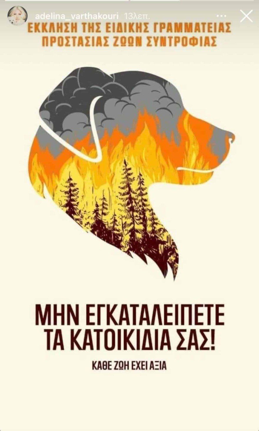 Ανάμεσά τους και η Αντελίνα Βαρθακούρη, η οποία δημοσίευσε στον προσωπικό της λογαριασμό στο Ιnstagram δύο story, μέσα από τα οποία κάνει έκκληση τόσο για βοήθεια όσο και για το να μην εγκαταλείπουν τα κατοικίδιά τους.