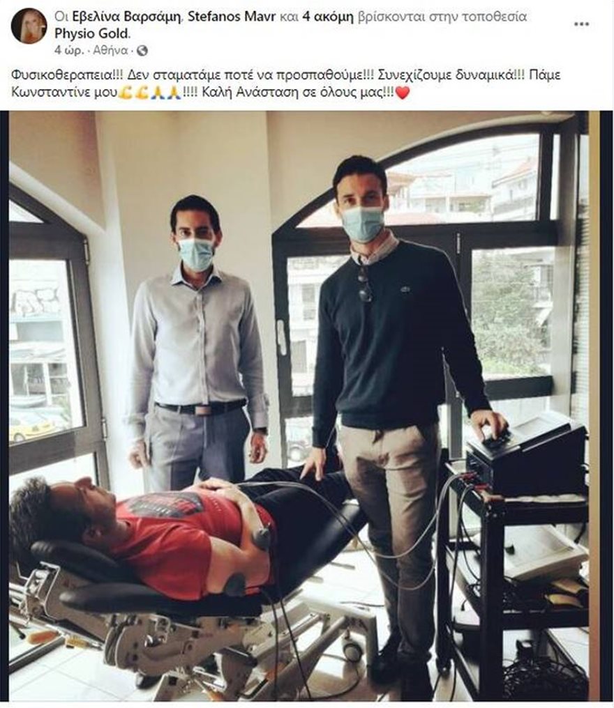 «Φυσικοθεραπεία!!! Δεν σταματάμε ποτέ να προσπαθούμε!!! Συνεχίζουμε δυναμικά!!! Πάμε Κωνσταντίνε μου💪💪🙏🙏!!!! Καλή Ανάσταση σε όλους μας!!» έγραψε η σύζυγος του Κωνσταντίνου Αγγελίδη.