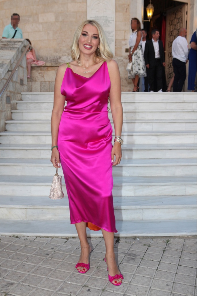 Η Κωνσταντίνα Σπυροπούλου εμφανώς αδυνατισμένη για την περίσταση επέλεξε ένα φούξια σατέν φόρεμα συνδυασμένο με επίσης φούξια mules.