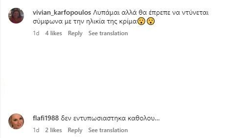 «Πολύ ωραίο… αλλά αδικείς τη δημιουργία σου φορώντας τη σε μια 50+», υπογράμμισε μια ακόλουθος, με τη σχεδιάστρια να απαντά «Αν για εσάς η ηλικία είναι εμπόδιο, για μένα είναι ένας αριθμός που δεν με περιορίζει 😘».