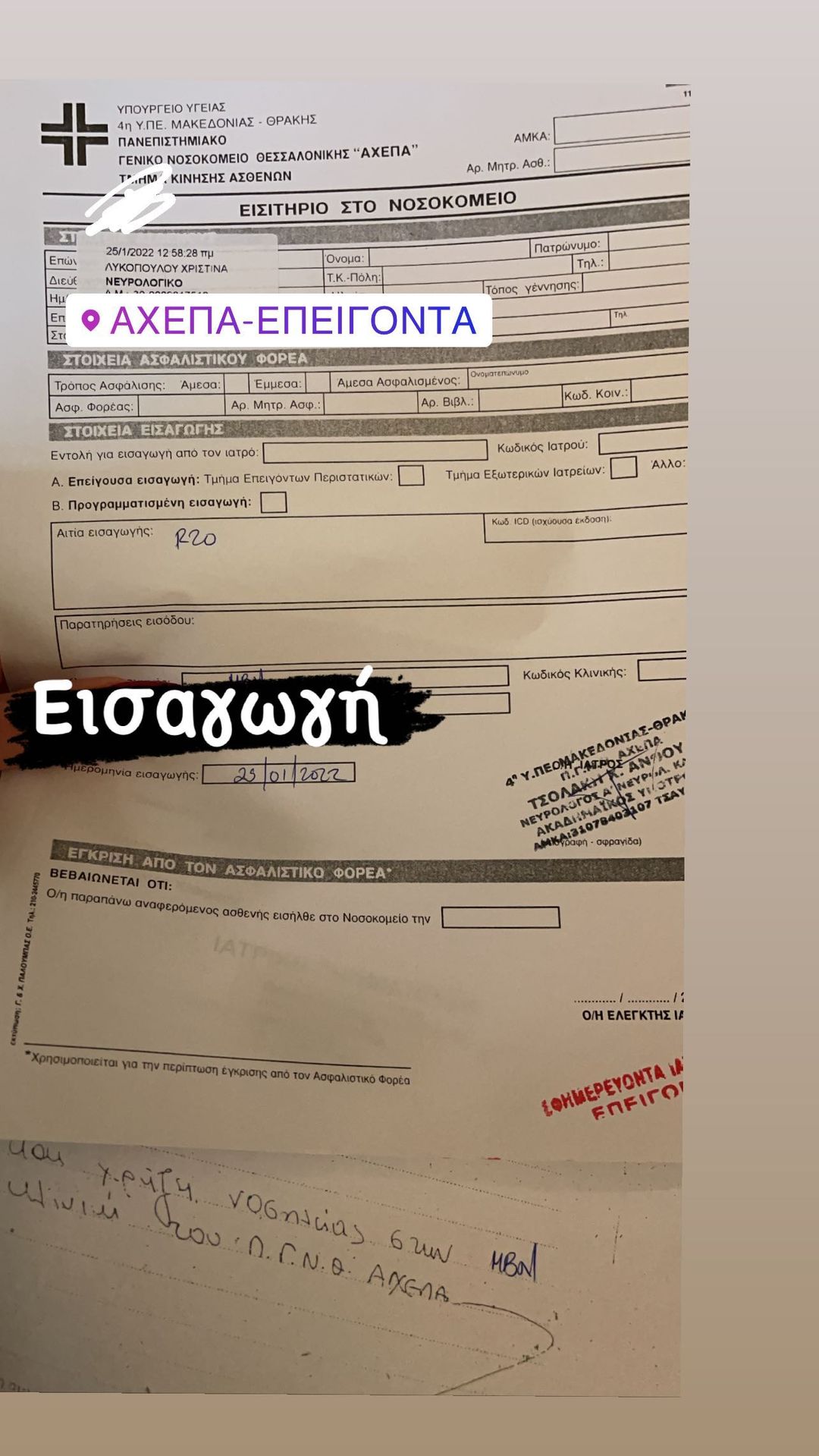 Η ίδια διακομίσθηκε στο νοσοκομείο ΑΧΕΠΑ της Θεσσαλονίκης, όπου της έγινε εισαγωγή, διότι την ενημέρωσαν ότι υπέστη κρίση εγκεφαλικού επεισοδίου.