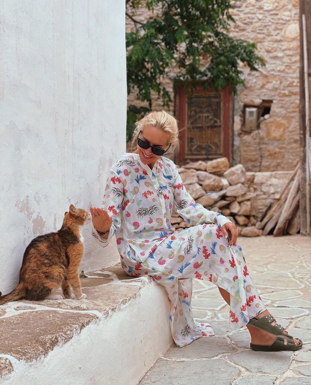 Η παρουσιάστρια δημοσίευσε μια φωτογραφία της από την Μύκονο όπου την βλέπουμε να απολαμβάνει το cocktail της φορώντας ένα μαύρο cut-out ολόσωμο μαγιό που αναδείκνυε το καλλίγραμο κορμί της. Την εμφάνισή της ολοκλήρωσαν τα μαύρα γυαλιά ηλίου και τα χρυσά κολιέ που κοσμούσαν τον λαιμό της.