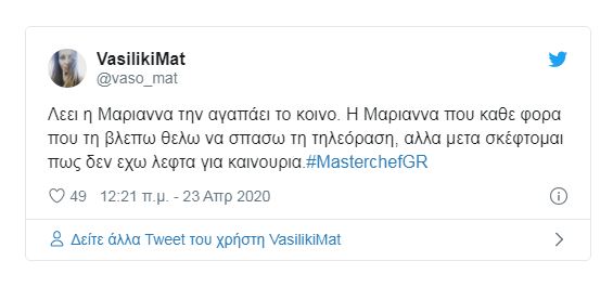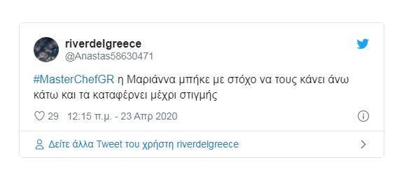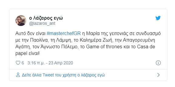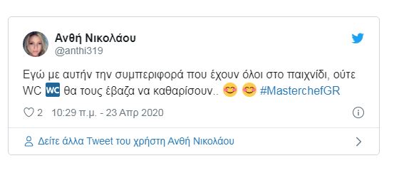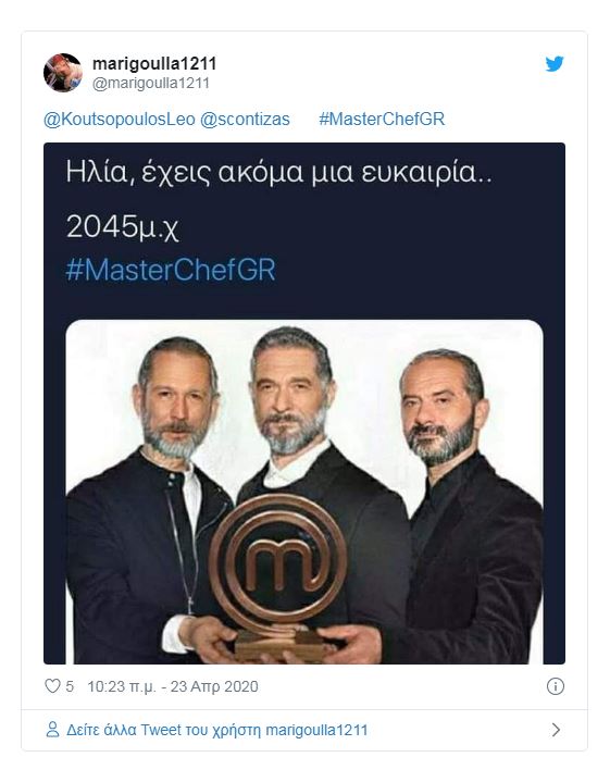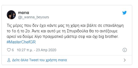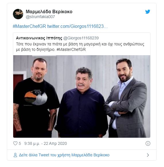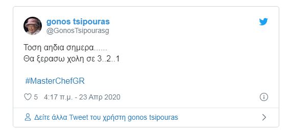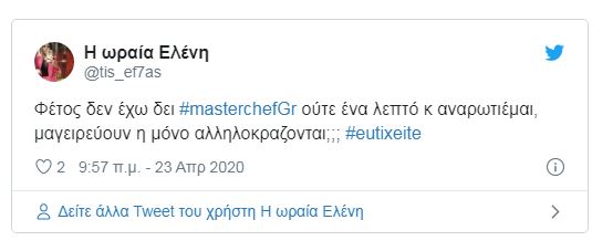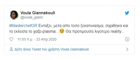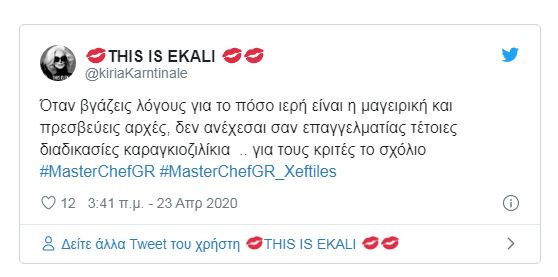 Αναρωτηθήκαμε μήπως μόνο εμάς ενόχλησε το τόσο έντονο ριάλιτι στοιχείο. Τους αξιαγάπητους κριτές του MasterChef δεν φαίνεται να τους ενοχλεί που δίνουν το όνομα και το κύρος τους σε ένα τέτοιο πρόγραμμα, οπότε μήπως κάτι δεν πάει καλά με εμάς; Την αρνητική απάντηση μας την έδωσε το Twitter. Εκνευρισμός κι εκεί με όσα έβλεπαν οι τηλεθεατές στις οθόνες τους. Εκνευρισμός που εκφράστηκε με σύντομο και περιεκτικό τρόπο, στα tweets τους.