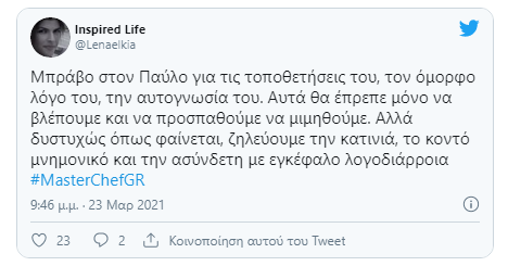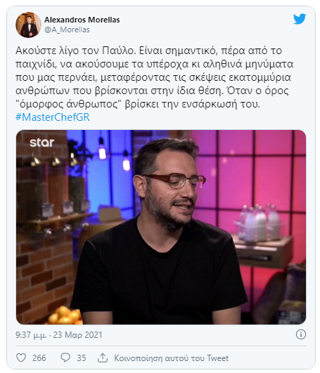 «Το τι θα πουν οι άλλοι το έχω ξεπεράσει προ πολλού. Εδώ δεν με νοιάζει τι θα πουν οι δικοί μου μερικές φορές. Δεν μπορείς να ακούς συνέχεια τι έχουν να πουν οι άλλοι. Είναι η δικιά τους οπτική και μερικές φορές, όταν δεν έχεις το βίωμα, δεν πρέπει να μιλάς. Όπως για παράδειγμα οι άνδρες. Δεν ξέρεις πώς είναι να περπατάς σαν γυναίκα μέσα σε αυτόν τον κόσμο. Δεν ξέρεις πώς είναι να περπατάς σαν γκέι μέσα σε αυτόν τον κόσμο» είπε στη συνέχεια στην κάμερα του «MasterChef», πριν κλείσει, τονίζοντας: «Σεβαστή η άποψή σου, αλλά άκου με κι εμένα που έχω το βίωμα».