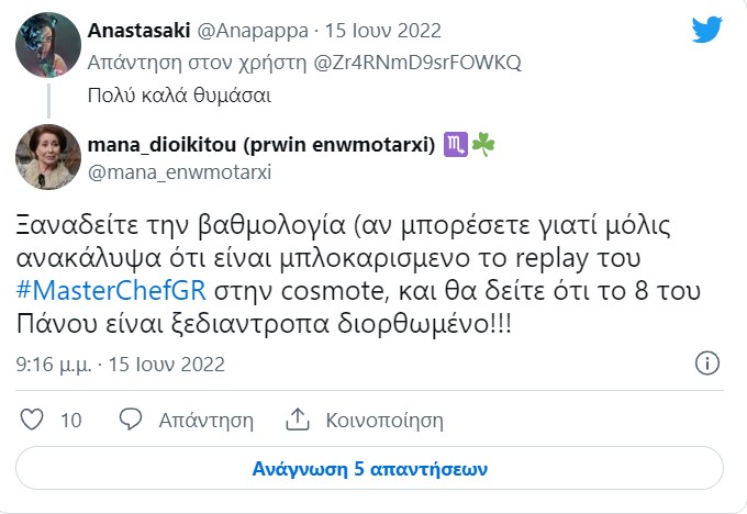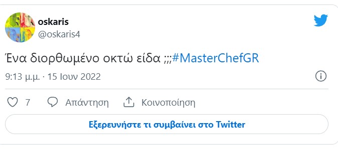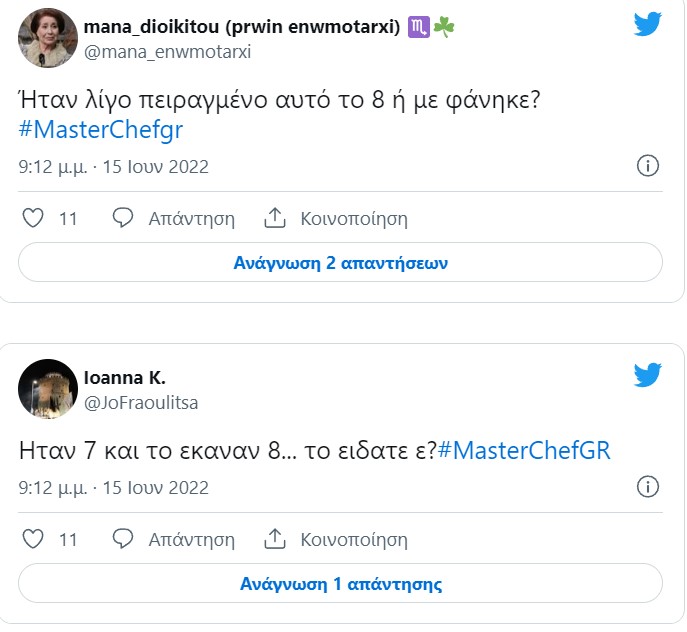 Ο Πάνος προηγείται με 21 βαθμούς έναντι 20 της Καλλιόπης. H Καλλιόπη πήρε 7/10 από τον Θάνο Φέσκο & τον Γιώργο Παπαζαχαρία και μέχρι στιγμής έχει συγκεντρώσει 27 βαθμούς. Ο Πάνος πήρε 8/10 συγκεντρώνοντας 29 βαθμούς. Ωστόσο οι φανατικοί τηλεθεατές του MasterChef και χρήστες στο Twitter παρατήρησαν πως το 8 στη βαθμολογία του Πάνου ήταν κάπως «πειραγμένο».
