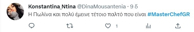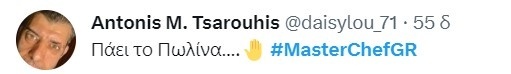 «Και την πατήσαμε και στο γλυκό ρε Πωλινάκι», της είπε χαρακτηριστικά ο Λεωνίδας Κουτσόπουλος μετά την ανακοίνωση των αποτελεσμάτων. Η Πωλίνα, πάντως, έφυγε με χαμόγελο από το MasterChef, ενώ προέβλεψε ότι η δυάδα του τελικού θα είναι ο Νίκος Τράκας και ο Δημήτρης Πολιτάκης.