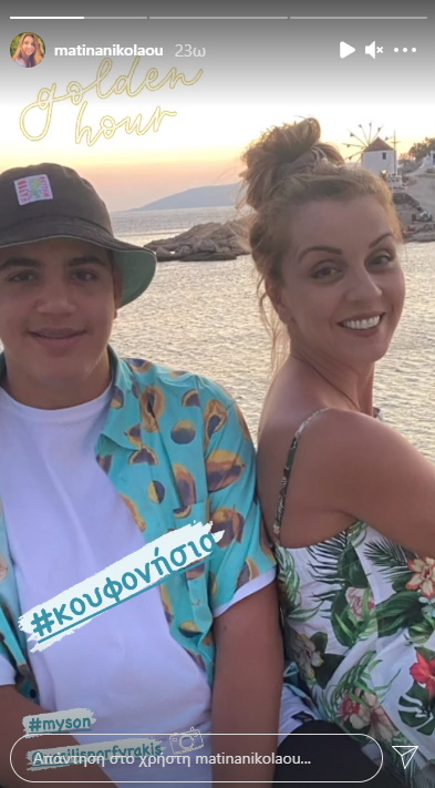 Το ζευγάρι ξεκουράζεται στο αγαπημένο τους νησί, μαζί με τον γιο της τηλεοπτικής «Βάνιας», Παναγιώτη και τον σκύλο τους. Μάλιστα εκείνη, μοιράζεται στιγμές και τοπία με τους followers της στο Instagram.