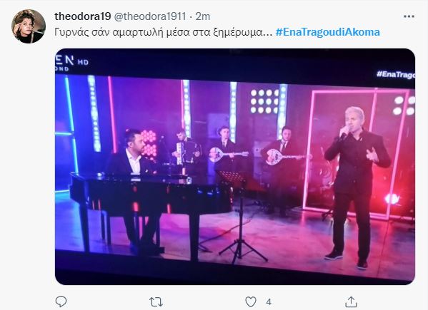 Ο Δημήτρης Κόκοτας εμφανίστηκε στο πλατό της εκπομπής του Γιώργου Θεοφάνους «Ένα τραγούδι ακόμα», το βράδυ της Παρασκευής και χάρισε στους τηλεθεατές μία μαγική βραδιά με πολλή μουσική και αγαπημένα τραγούδια, με τους χρήστες του Twitter να τον αποθεώνουν.