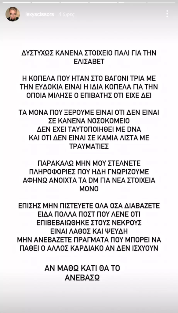 Έχει μια γατούλα που την έχει διασώσει η ίδια, είναι τυφλή και την φροντίζει και την αγαπάει πάρα πολύ. Είχε όνειρα και έχει, θα μιλάω στον ενεστώτα για την Ελισάβετ γιατί παρόλο που δεν έχει βρεθεί ακόμα, το κινητό της χτυπάει κανονικά», είπε χαρακτηριστικά.