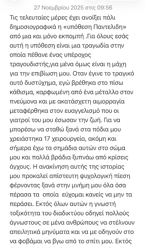 «Τις τελευταίες μέρες έχει ανοίξει πάλι δημοσιογραφικά η “υπόθεση Παντελίδη” από μια και μόνο εκπομπή. Για όλους εσάς αυτή η υπόθεση είναι μια τραγωδία στην οποία πέθανε ένας υπέροχος τραγουδιστής, για μένα όμως είναι η μάχη για την επιβίωσή μου. Όταν έγινε το τραγικό αυτό δυστύχημα, εγώ βρέθηκα στο πίσω κάθισμα, καρφωμένη από ένα μέταλλο στον πνεύμονα και με ακατάσχετη αιμορραγία. Μεταφέρθηκα στον Ευαγγελισμό, όπου οι γιατροί του μου έσωσαν τη ζωή. Για να μπορέσω να σταθώ ξανά στα πόδια μου χρειάστηκα 17 χειρουργεία. Ακόμη και σήμερα έχω τα σημάδια αυτών στο σώμα μου και πολλά βράδια ξυπνάω από κρίσεις άγχους.