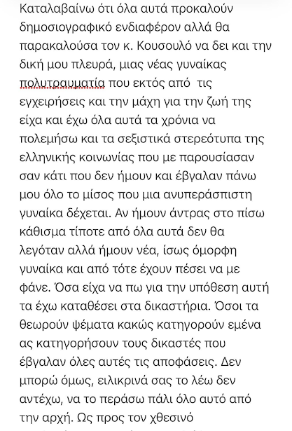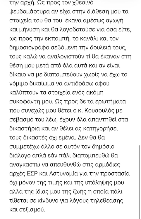 Ως προς δε τα ερωτήματα που συνεχώς μου θέτει ο κ. Κουσουλός, με σεβασμό τού λέω: έχουν όλα απαντηθεί στα δικαστήρια και αν θέλει ας κατηγορήσει τους δικαστές, όχι εμένα. Δεν θα συμμετέχω άλλο σε αυτόν τον δημόσιο διάλογο. Απλά, εάν πάλι διαπομπευθώ, θα αναγκαστώ να απευθυνθώ στις αρμόδιες αρχές, ΕΣΡ και Αστυνομία, για την προστασία όχι μόνο της τιμής και της υπόληψής μου, αλλά της ίδιας μου της ζωής, η οποία πάλι τίθεται σε κίνδυνο για λόγους τηλεθέασης και σεξισμού.