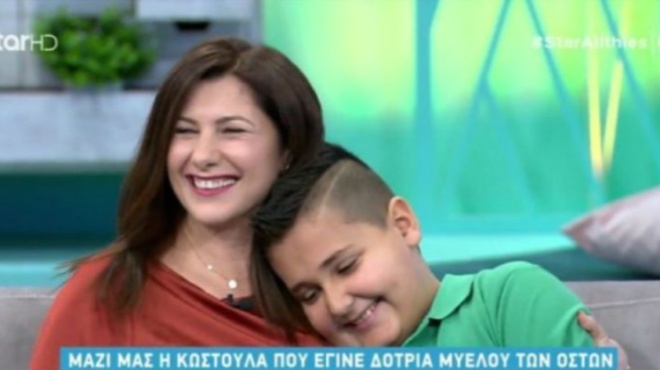 «Μαζί μας η Κωστούλα, μια σπουδαία γυναίκα και μητέρα τριών παιδιών, που έγινε δότρια μυελού των οστών και με την πράξη της αυτή “ξαναγέννησε” τον δεκάχρονο σήμερα Γιώργο, το τέταρτο “παιδί” της. Οι δυο τους συναντιούνται στο πλατό της εκπομπής και η συγκίνηση είναι πολύ μεγάλη.
