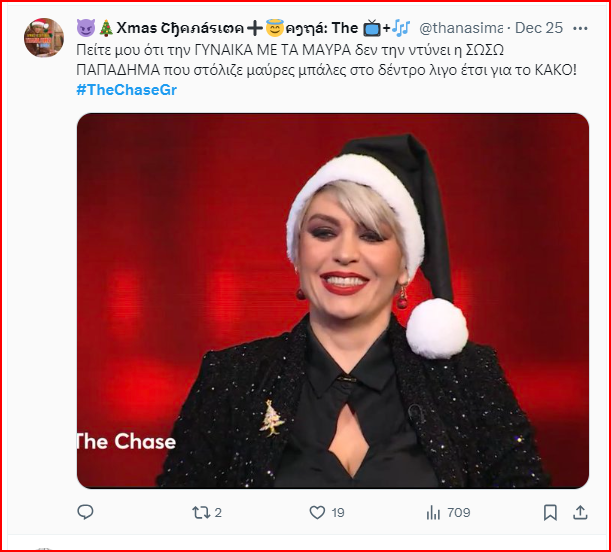 Η Μαρία Μάρκου εμφανίστηκε με σκουφί του Άγιου Βασίλη στα εορταστικά επεισόδια του “The Chase” και θύμισε στο τηλεοπτικό κοινό και τους χρήστες των social media μία προσωπικότητα γνωστής και επιτυχημένης κωμικής σειράς, ‘Τα εγκλήματα”.
