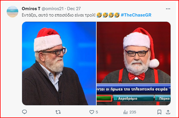 Ειδικότερα, τα εορταστικά επεισόδια του “The Chase” ήταν απολαυστικά με τον Αδέκαστο Επιθεωρητή και τη Γυναίκα με τα Μαύρα να έχουν το καλύτερο dress code και να τρολάρονται από το Twitter για τις εμφανίσεις τους.
