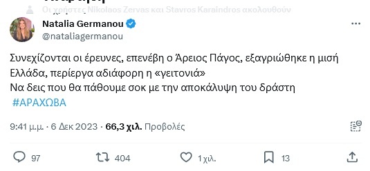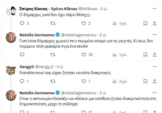 Παράλληλα, σε χθεσινές τις αναρτήσεις στο twitter, η Ναταλία Γερμανού έγραψε αυτό που πολλοί σκέφονται πλέον για τον δράστη και τους λόγους που ακόμα δεν έχει βρεθεί…