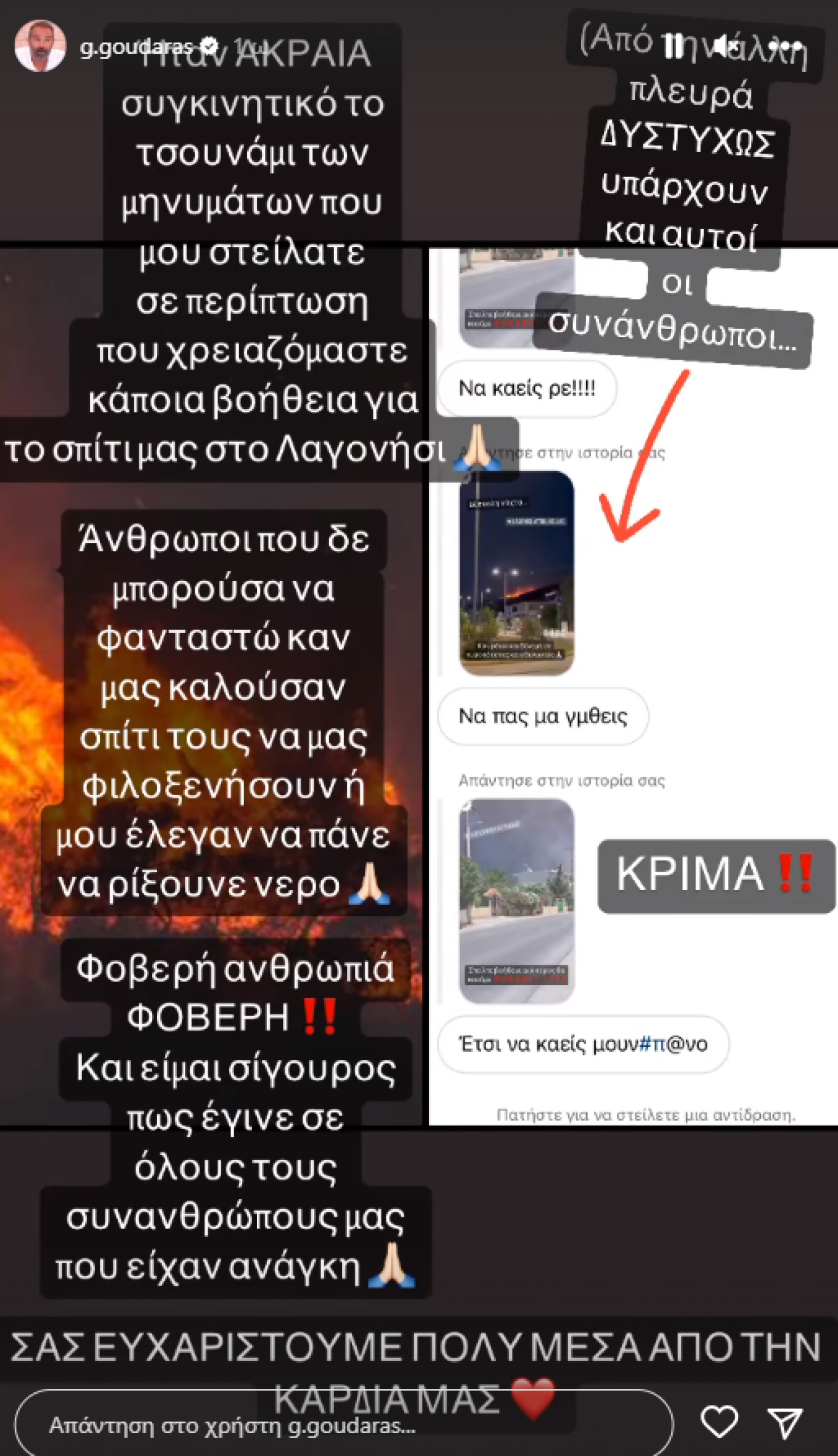Όταν η φωτιά εξαπλώθηκε στο Λαγονήσι, όπου ζει με την οικογένειά του και έχει μια επιχείρηση με τη σύζυγό του, ο Γρηγόρης άρχισε να ανεβάζει στο Instagram stories, ζητώντας βοήθεια. Την επόμενη μέρα, ο παρουσιαστής ήθελε να ευχαριστήσει τους ανθρώπους που εκδήλωσαν ενδιαφέρον και προσφέρθηκαν να βοηθήσουν, αν κάτι τέτοιο ήταν απαραίτητο.