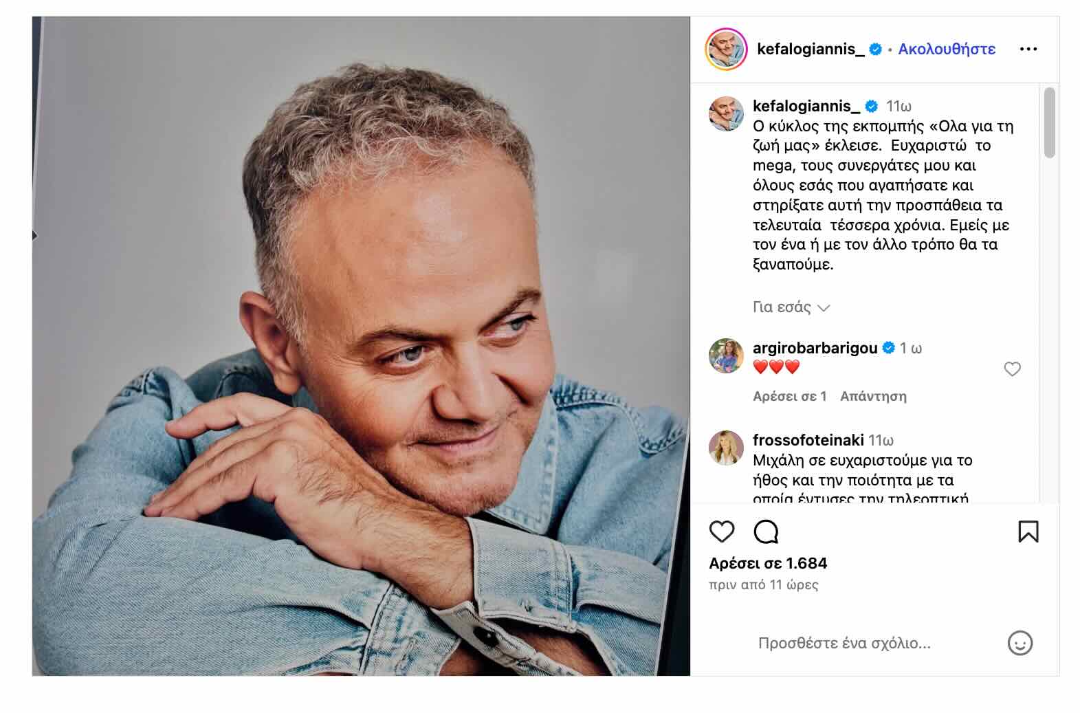 «Ο κύκλος της εκπομπής ‘Όλα για τη ζωή μας’ έκλεισε. Ευχαριστώ το mega, τους συνεργάτες μου και όλους εσάς που αγαπήσατε και στηρίξατε αυτή την προσπάθεια τα τελευταία τέσσερα χρόνια. Εμείς με τον ένα ή με τον άλλο τρόπο θα τα ξαναπούμε», έγραψε χαρακτηριστικά.