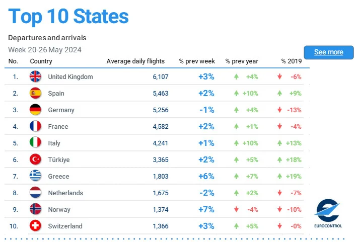Η Ελλάδα σημειώνει σημαντική αύξηση στην κατάταξη του Top 10 της αεροπορικής κίνησης στην Ευρώπη, κάτι που ενισχύει τις προβλέψεις για την υπέρβαση του περσινού ρεκόρ.