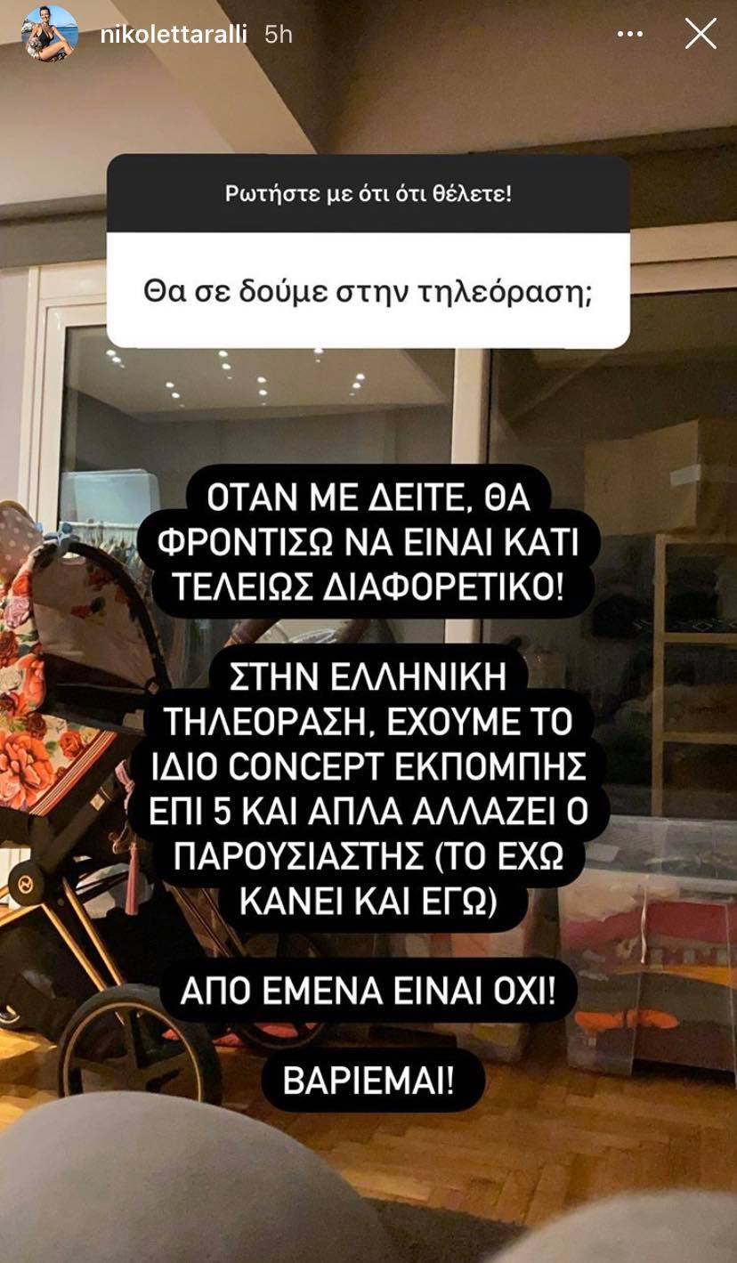 «Όταν με δείτε θα φροντίσω να είναι κάτι τελείως διαφορετικό! Στην ελληνική τηλεόραση έχουμε το ίδιο concept εκπομπής επί πέντε και απλά αλλάζει ο παρουσιαστής (το έχω κάνει και εγώ). Από εμένα είναι όχι! Βαριέμαι!», είχε πει η Νικολέττα Ράλλη.