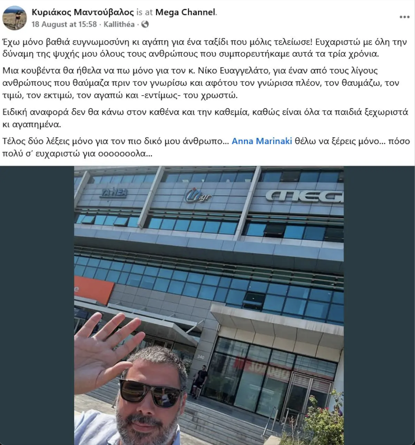 Λίγο πριν την πρεμιέρα της εκπομπής του Νίκου Ευαγγελάτου σημειώθηκε μια αποχώρηση που κανείς δεν περίμενε. Ο δημοσιογράφος Κυριάκος Μαντούβαλος έκανε γνωστό ότι αποχωρεί από το Mega. Σας θυμίζουμε ότι ίδιος κάλυπτε καθημερινά ρεπορτάζ από κάθε γωνιά της Ελλάδας, μεταφέροντας ζωντανά όλες τις εξελίξεις στο στούντιο.