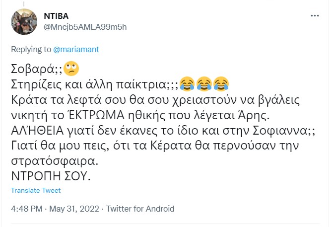 Ωστόσο, ορισμένοι χρήστες του Twitter σχολίασαν αρκετά αρνητικά το γεγονός ότι η Μαρία Αντωνά στηρίζει τη Μαίη.