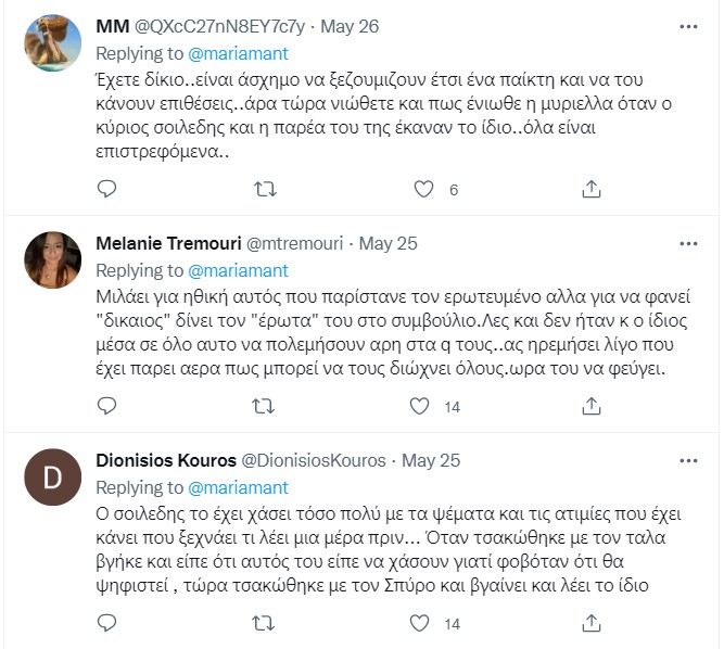 Και συνέχισε γράφοντας: «Του έχετε θίξει οικογένεια, σπίτι, σχέση, ζωή τα πάντα όλα επειδή είναι ΠΑΙΚΤΑΡΑΣ και θέλετε, ζητάτε, απαιτείτε να σας φέρεται με ηθική και μιλάτε για διδασκαλία ηθικής? αλήθεια τώρα?». Χρήστες στο twitter έσπευσαν να σχολιάσουν όχι την στάση του Μαρτίκα, αλλά του Άρη Σοϊλέδη.