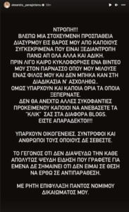 Όμως υπάρχουν κάποια όρια τα οποία ξεπερνάτε. Δεν θα ανεχτώ άλλες συκοφαντίες προκειμένου κάποιοι να ανεβάσετε τα “κλικ” σας στα διάφορα blogs. Είστε απαράδεκτοι! Υπάρχουν οικογένειες, σύντροφοι και άνθρωποι τους οποίους δεν σέβεστε! Το γεγονός ότι δεν διαψεύδω την κάθε ψευδή είδηση που γράφετε για εμένα, δεν σημαίνει πως δεν είμαι σε θέση να έρθω σε αντιπαράθεση. Με ρητή επιφύλαξη παντός νόμιμου δικαιώματός μου», έγραψε χαρακτηριστικά η Αλεξάνδρα Παναγιώταρου.