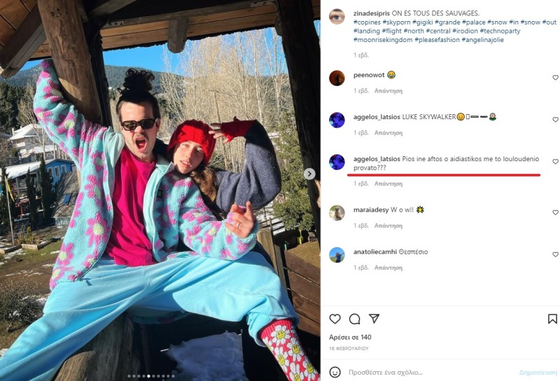 Μάλιστα, εντύπωση προκάλεσε το look του Άγγελου Λάτσιου σε μια φωτογραφία της Ζήνας Δεσύπρη, με τον γιο της Ελένης Μενεγάκη να αυτοσαρκάζεται και να αποκαλεί τον εαυτό του «ο αηδιαστικός με το λουλουδένιο πρόβατο;».