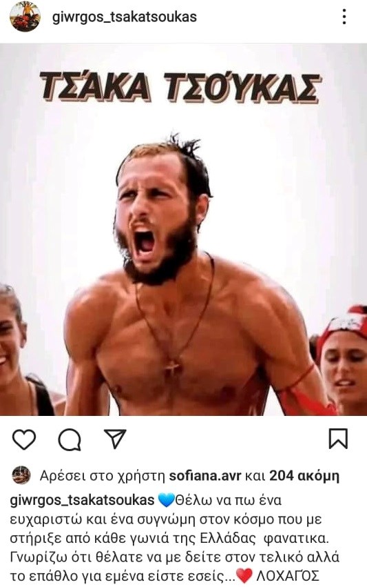 «Θέλω να πω ένα ευχαριστώ και ένα συγνώμη στον κόσμο που με στήριξε από κάθε γωνιά της Ελλάδας φανατικά. Γνωρίζω ότι θέλατε να με δείτε στον τελικό αλλά το έπαθλο για εμένα είστε εσείς… ΛΟΧΑΓΌΣ» έγραψε χαρακτηριστικά ο Γιώργος Κατσαούνης.
