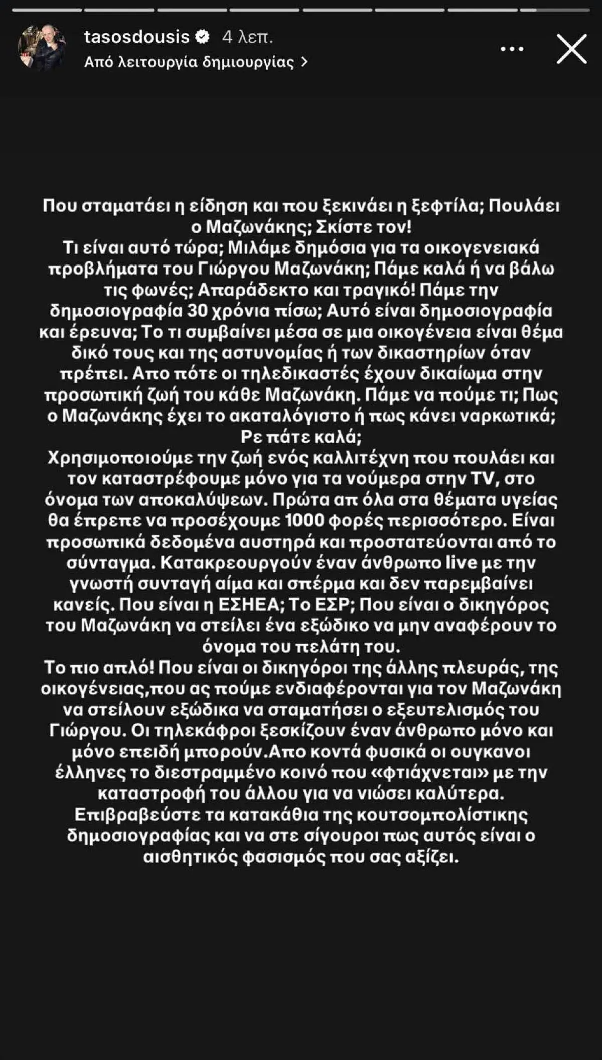 Η ανάρτηση του Τάσου Δούση για την υπόθεση Μαζωνάκη