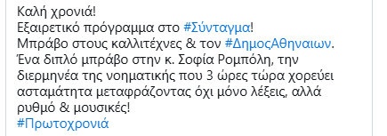 Η Σοφία Ρομπόλη η οποία έχει βραβευτεί για τη σπουδαία δουλειά της ως διερμηνέας νοηματικής και ανήκει στο δυναμικό του Alpha χθες το βράδυ (31/12) στην αλλαγή του χρόνου που μεταδόθηκε από το κανάλι σε απευθείας σύνδεση, αποθεώθηκε στο Twitter/X για τη δουλειά της.