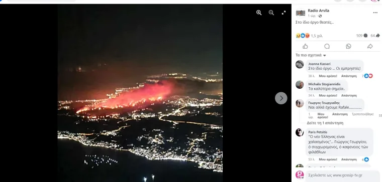 Στην ανατολική Αττική, η οποία πλήττεται σοβαρά από πυρκαγιά, οι Ράδιο Αρβύλα ανήρτησαν ένα σχετικό μήνυμα στον λογαριασμό τους στο Facebook, συνοδεύοντας το με την ανησυχητική εικόνα της καμένης περιοχής. Στο post τους, οι δημοφιλείς παρουσιαστές χρησιμοποίησαν τη φράση «Στο ίδιο έργο θεατές», υποδηλώνοντας την επανάληψη της κρίσιμης κατάστασης που έχει καταβάλει την περιοχή.