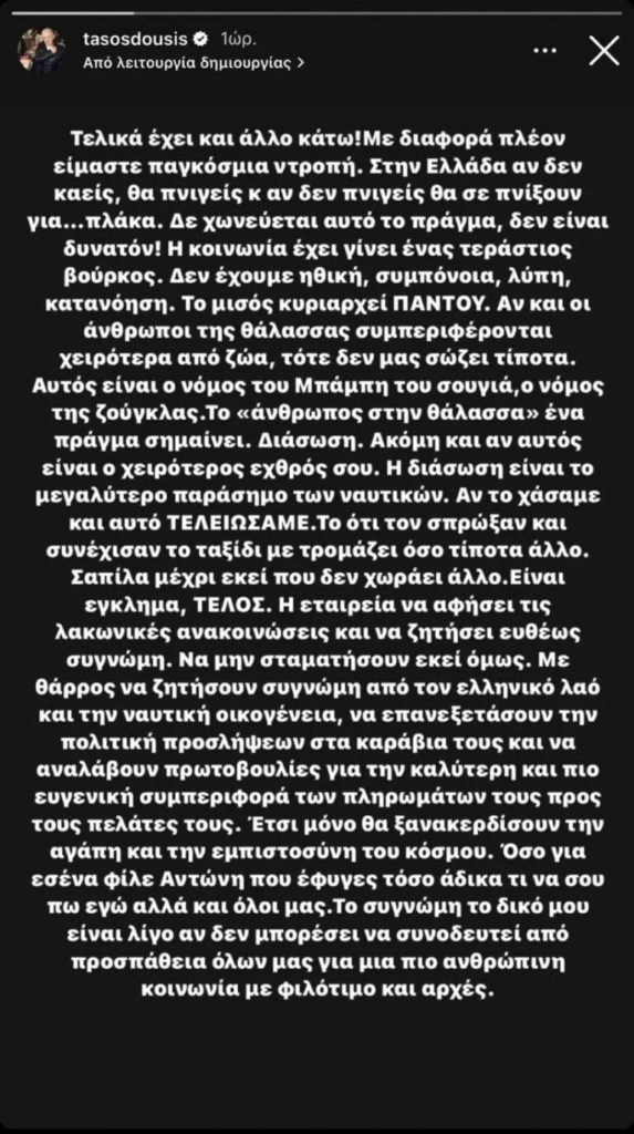 Ο Τάσος Δούσης, μάλιστα, παρακολουθώντας τις τελευταίες εξελίξεις και τις μαρτυρίες για την υπόθεση Blue Horizon, προχώρησε σε μία μακροσκελή ανάρτηση στον προσωπικό του λογαριασμό στο Instagram, αποκαλύπτοντας τα λάθη που έγιναν, εκφράζοντας την απογοήτευσή του για την έλλειψη ανθρωπιάς που χαρακτηρίζει την ελληνική κοινωνία.