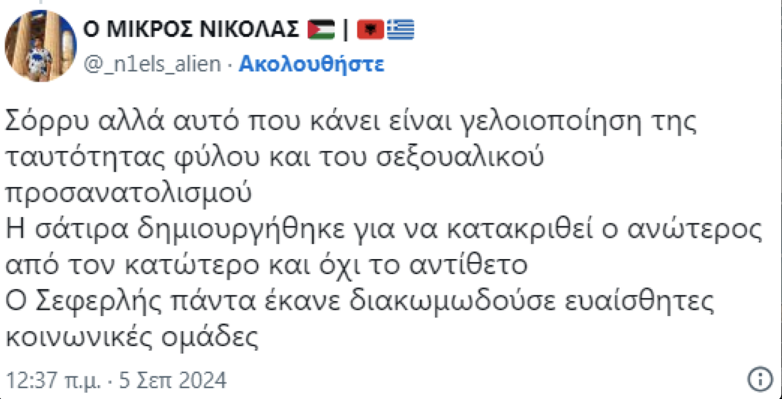 Άλλος χρήστης, σχολιάζει «αυτό που κάνει είναι γελοιοποίηση της ταυτότητας φύλου και του σεξουαλικού προσανατολισμού».