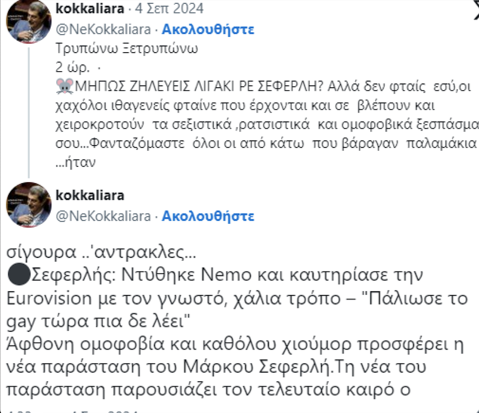 Ένα από τα μηνύματα εναντίον του, έγραφε: «Όταν ο Σεφερλης γεμίζει θέατρο κοροϊδεύοντας μην σου κάνουν εντύπωση περιστατικά βίας. Μη σου κάνει εντύπωση η ομοφοβία. Μη σου κάνει εντύπωση το αστείο για την ” πο..ρα “. Για τα “σύκα”. Για την “αδέρφω ” εκεί έξω. Είμαστε άξιοι της τρισάθλιας μοίρας μας».