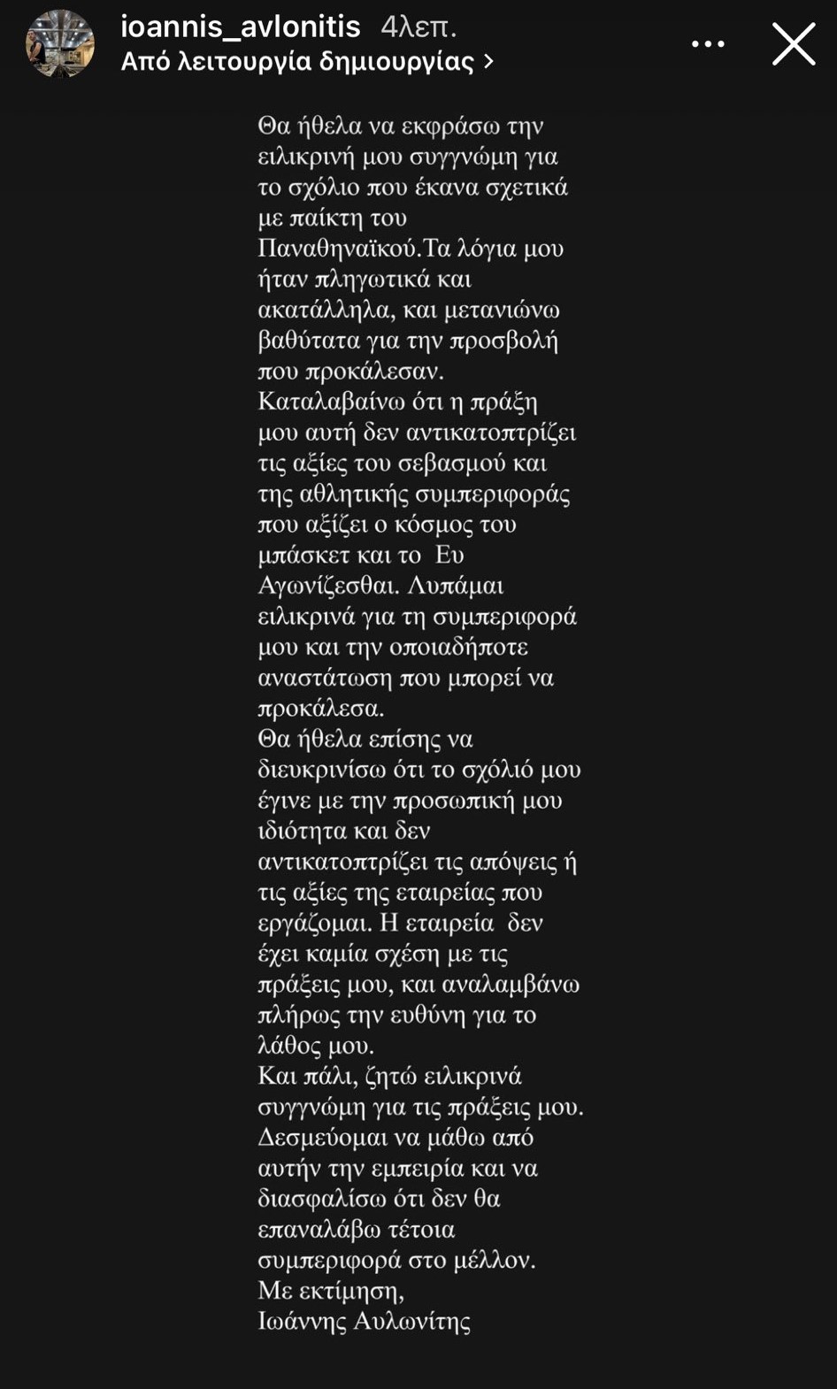 Τις τελευταίες ώρες έχει γίνει viral ένα σχόλιο από έναν πρώην συμμετέχοντα του Masterchef. Ο Ιωάννης Αυλωνίτης, ο οποίος εργάζεται ως μάγειρας σε εστιατόριο των βορείων προαστίων, προέβη σε ένα εμετικό και χυδαίο σχόλιο για τον Κώστα Σλούκα, ευχόμενος σοβαρό τραυματισμό του MVP του Final Four. Φυσικά, αυτό δεν πέρασε απαρατήρητο.