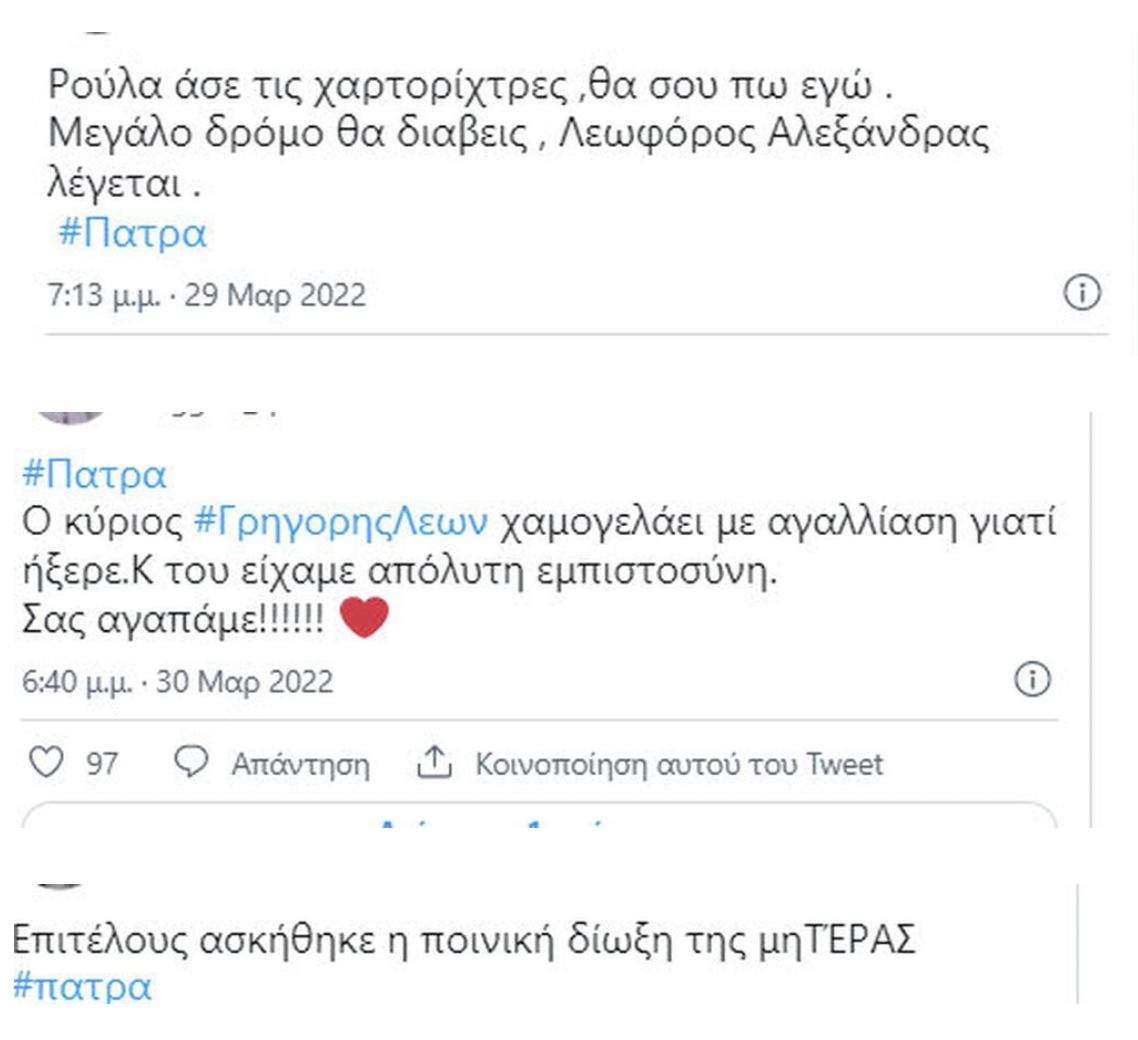 Πάρτι θετικών και αρνητικών σχολίων ξέσπασε στο Twitter σχετικά με τις εξελίξεις στην Πάτρα μετά τη σύλληψη της Ρούλας Πισπιρίγκου.