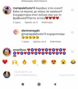 Ωστόσο, αυτή τη φορά η Ελένη Μενεγάκη δεν δίστασε να κάνει μια νέα δημοσίευση μαζί με τον Μάκη Παντζόπουλο όπου προκάλεσε πολλές αντιδράσεις στα social media μιας και τα σχόλια των χρηστών στο instagram πήραν “φωτιά” από τους θαυμαστές της. Μεταξύ άλλων, της σχολίασαν χαρακτηριστικά «Ακριβώς έτσι είναι! Καλά να περνάς με όσους σε αγαπούν. Συγχαρητήρια στον σύζυγό σου για τη βράβευση. Πάντα τέτοια…».