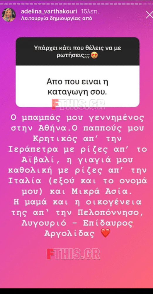 Μεγάλη εντύπωση και έκπληξη προκάλεσαν οι αποκαλύψεις της Αντελίνας Βαρθακούρη σχετικά με την καταγωγή της, ύστερα από ερωτήσεις που δέχθηκε από τους διαδικτυακούς της φίλους στο Instagram.