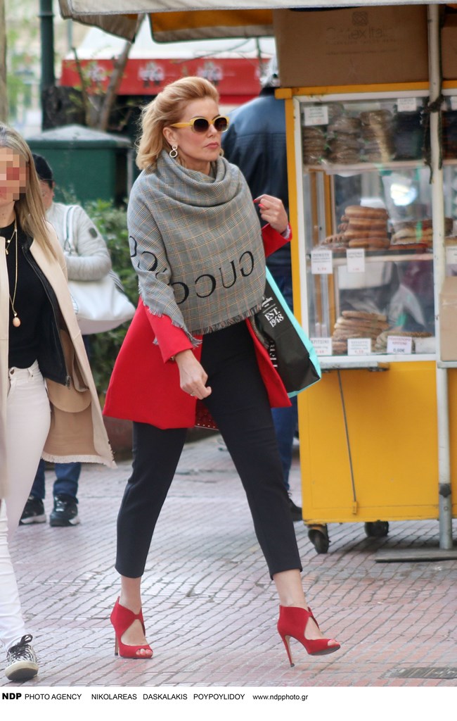 Πάνω από το μπλέιζερ, φόρεσε μια γκρι πασμίνα που έφερε το λογότυπο του οίκου Gucci. Αν και λίγο υπερβολική για μια πρωινή εμφάνιση, η Μανωλίδου δεν είχε πρόβλημα να περπατήσει πάνω στα ψηλοτάκουνα βραδινά παπούτσια της στους δρόμους της Αθήνας. Άλλωστε η ίδια συνηθίζει να ντύνεται επίσημα ακόμα και το πρωί, ενώ δεν αποχωρίζεται ποτέ τις ψηλοτάκουνες γόβες της.