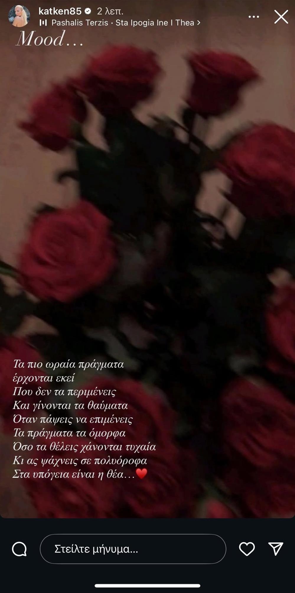 Την Παρασκευή το βράδυ, η Κατερίνα Καινούργιου, η οποία είναι ιδιαίτερα ενεργή στα social media, δημοσίευσε μια ρομαντική φωτογραφία, και στην λεζάντα έγραψε ορισμένους στίχους από το τραγούδι του Πασχάλη Τερζή “Στα υπόγεια είναι η θέα”.
