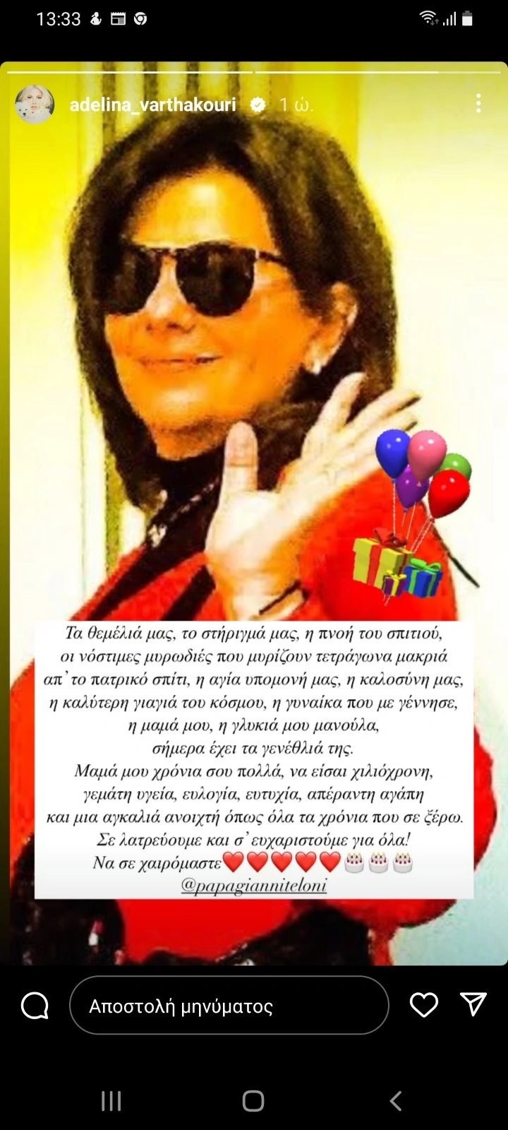 «Τα θεμέλιά μας, το στήριγμά μας, η πνοή του σπιτιού, η γλυκιά μου μανούλα, σήμερα έχει τα γενέθλιά της!»