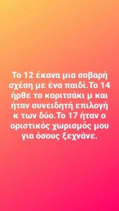«Να σας πω κι εγώ λοιπόν δύο λόγια για τη ζωή μου, γιατί λένε τόσα οι άλλοι δημόσια και δε μιλάω μήνες. Νομίζω πως έχω κι εγώ το δικαίωμα να μιλήσω για την προσωπική μου ζωή εν τέλει. Το ’12 έκανα μία σοβαρή σχέση με ένα παιδί. Το ’14 ήρθε το κοριτσάκι μου και ήταν συνειδητή επιλογή και των δύο. Το ’17 ήταν ο οριστικός χωρισμός μου για όσους ξεχνάνε.