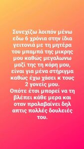Συνεχίζω λοιπόν, μένω εδώ 6 χρόνια στην ίδια γειτονιά με τη μητέρα του μπαμπά της μικρής μου καθώς μεγαλώνω μαζί της την κόρη μου, είναι για μένα στήριγμα καθώς έχω χάσει και τους δύο γονείς μου. Οπότε έτσι μπορεί να τη βλέπει κάθε μέρα και όταν προλαβαίνει δηλαδή από τις πολλές δουλειές του.