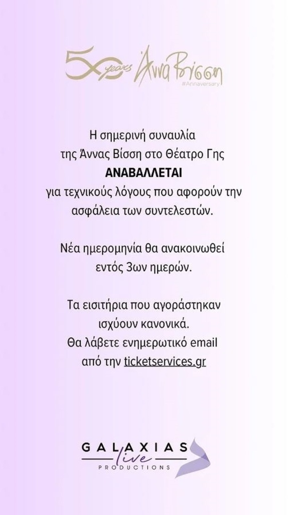«Η σημερινή συναυλία της Άννας Βίσση στο Θέατρο Γης αναβάλλεται για τεχνικούς λόγους που αφορούν την ασφάλεια των συντελεστών. Νέα ημερομηνία θα ανακοινωθεί εντός 3 ημερών. Τα εισιτήρια που αγοράστηκαν ισχύουν κανονικά, ζητούμε συγγνώμη για τυχόν αναστάτωση», αναφέρει χαρακτηριστικά η ανακοίνωση της εταιρίας παραγωγής.